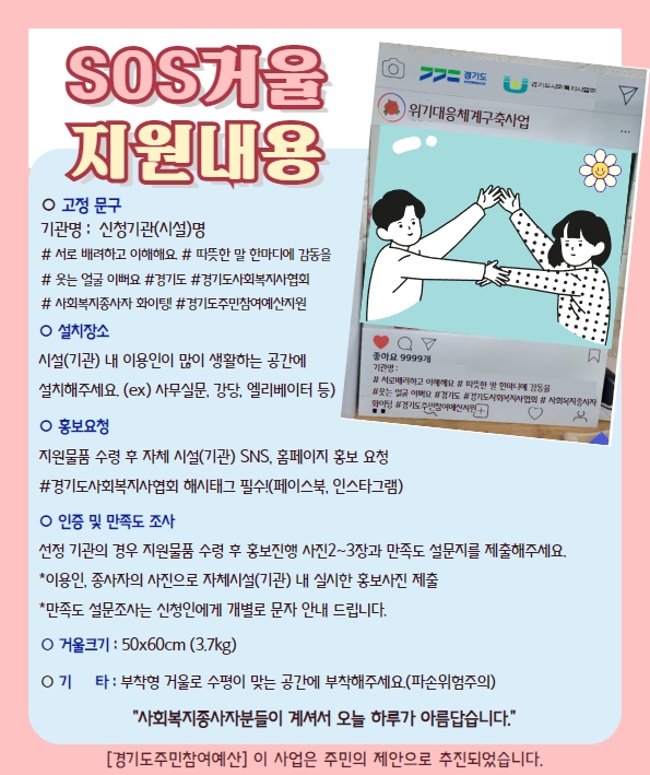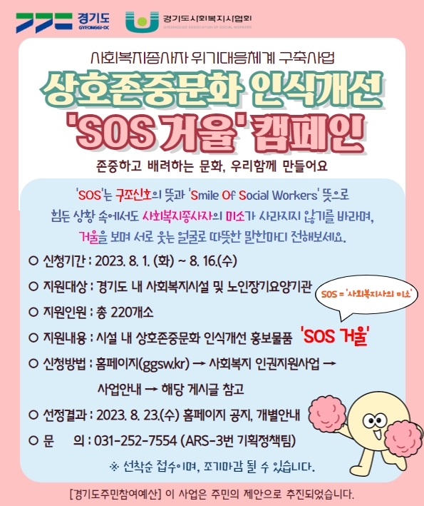 상호존중문화 인식개선 ‘SOS거울’ 캠페인은 힘든 상황 속에서도 사회복지종사자의 미소가 사라지지 않도록 거울을 보며 서로 웃는 얼굴로 따뜻한 말 한마디 전하는 캠페인입니다. 기관(시설) 내 서로 배려하고 존중하는 문화를 위해 적극적인 홍보 부탁드립니다 ^^
