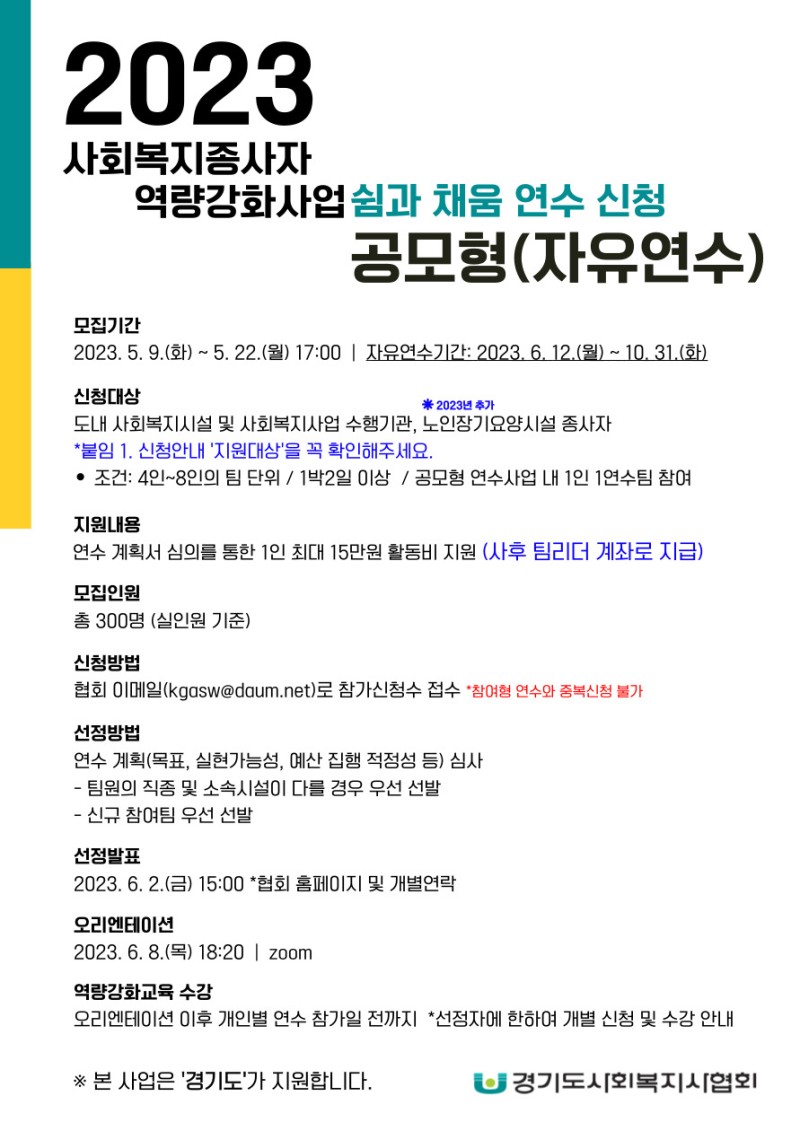 경기도사회복지사협회는 경기도 공모사업인 「2023년 사회복지종사자 역량강화사업」의 수행단체로 선정됨에 따라 도 내 사회복지종사자를 대상으로 역량강화교육, 쉼과 채움 연수(참여형/공모형) 사업을 준비하고 있습니다.