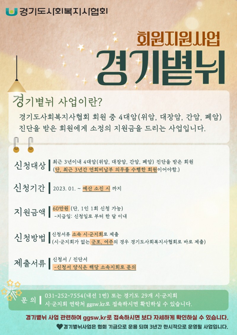 경기도사회복지사협회 회원 중4대암(위암,대장암,간암,폐암)진단을 받은 회원에게 소정의 지원금을 드리는 사업입니다.