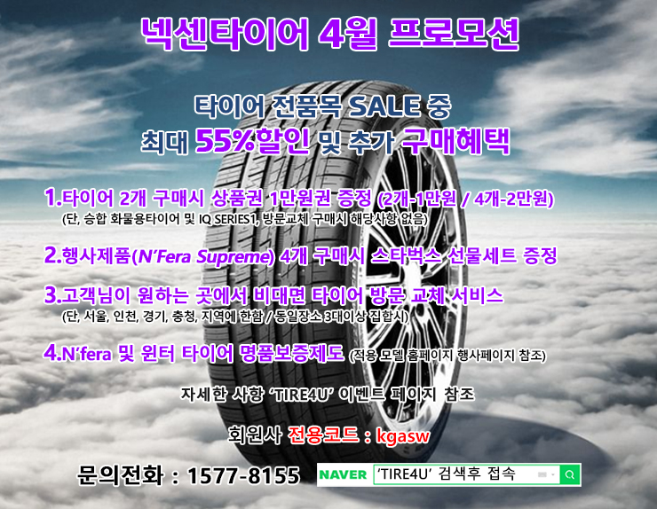 - 타이어 2개(차량 1대분) 구매 시 1만원 상품권 *2개-1만원/4개-2만원
