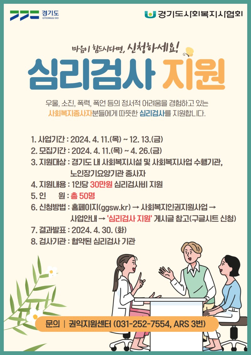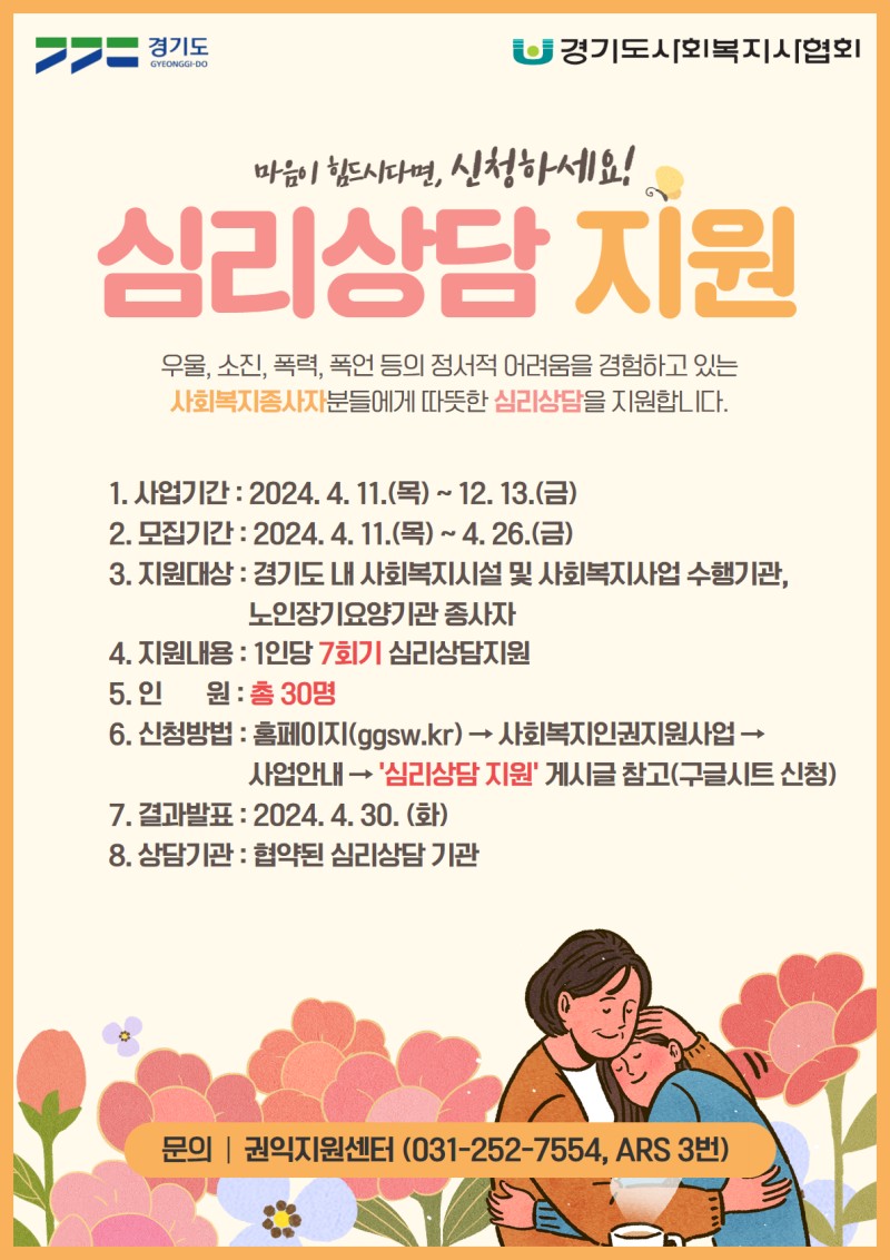 경기도사회복지사협회에서 2024년 사회복지종사자 인권보호지원사업에서 「심리지원사업」이 진행되어 안내드립니다.