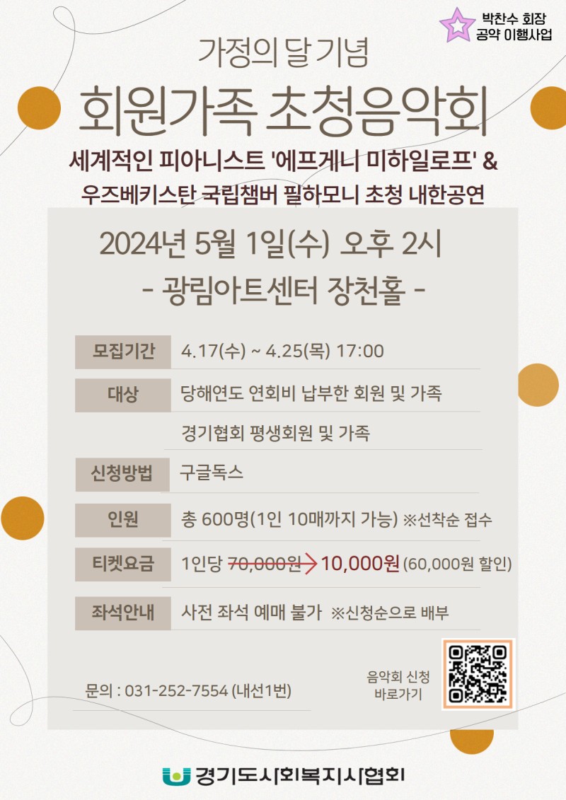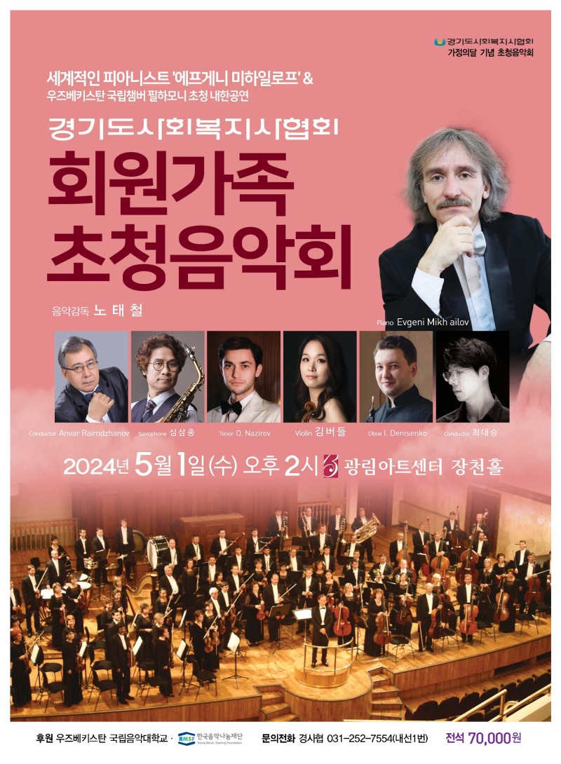 경기도사회복지사협회는 회원들의 문화활동을 지원하기 위해 세계적인 피아니스트 '에프게니 미하일로프 & 우즈베키스탄 국립챔버 필하모니 초청 내한공연’ 에 초대합니다.