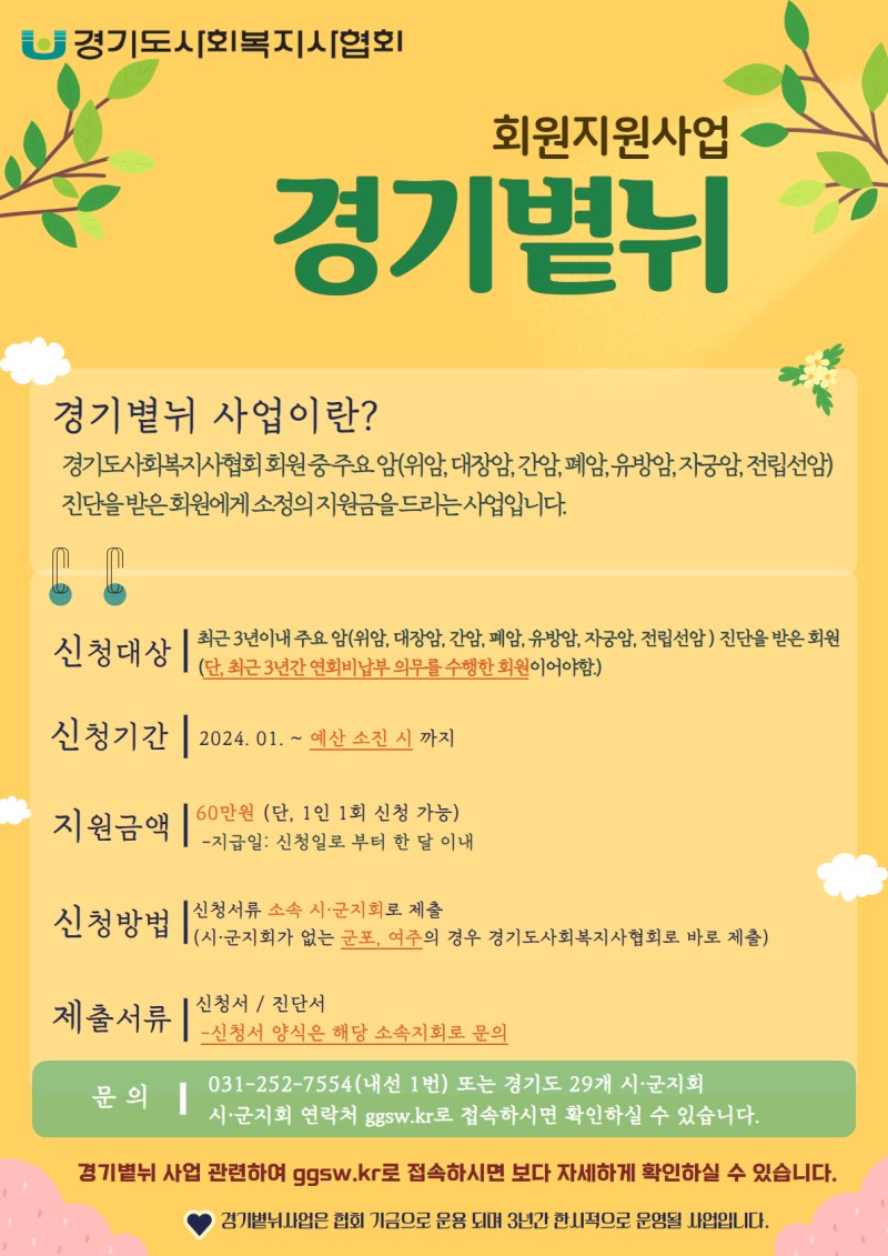 경기도사회복지사협회 회원 중 주요암 (위암,대장암,간암,폐암, 유방암, 자궁암, 전립선암)진단을 받은 회원에게 소정의 지원금을 드리는 사업입니다.