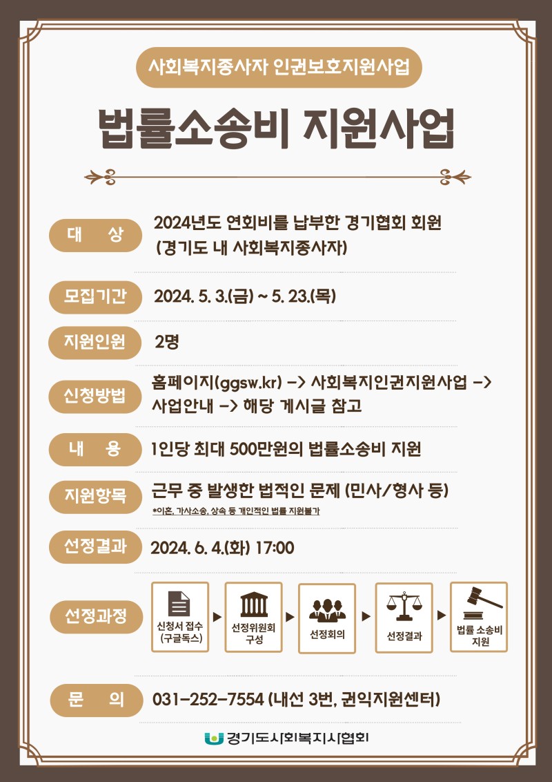 경기도사회복지사협회에서는 근무 중 발생한 법률소송문제에 있는 협회 회원들에게 법률문제로부터 안전과 노동 권리보호를 위해 법률소송비를 지원해드리고 있습니다.