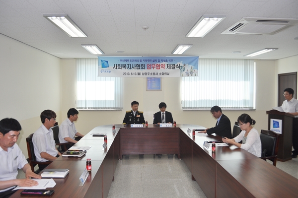 6월 10일(월) 오후3시 남양주소방서 소회의실에서 신종훈서장(남양주소방서장)과 황인성회장(남양주시사회복지사협회)을 비롯한 김도묵수석부회장(남양주시사회복지사협회), 신평식과장(남양주소방서예방과), 진금철팀장(남양주소방서대응안전), 임찬모팀장(남양주소방서예방팀)이 함께모여 오윤석팀장(예방과교육홍보팀)의 사회로 MOU체결식을 진행하였습니다.